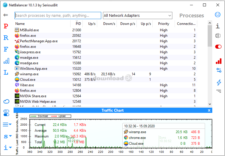 Browse and do any internet activity comfortably even when your download manager or torrent client downloads huge files from internet - just lower their network priority with NetBalancer.